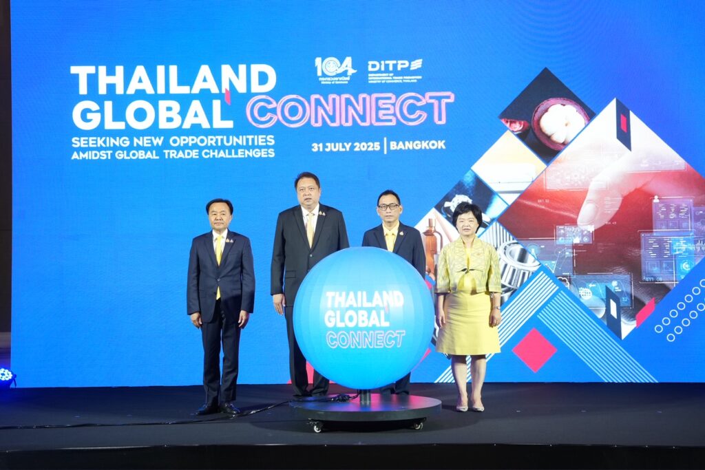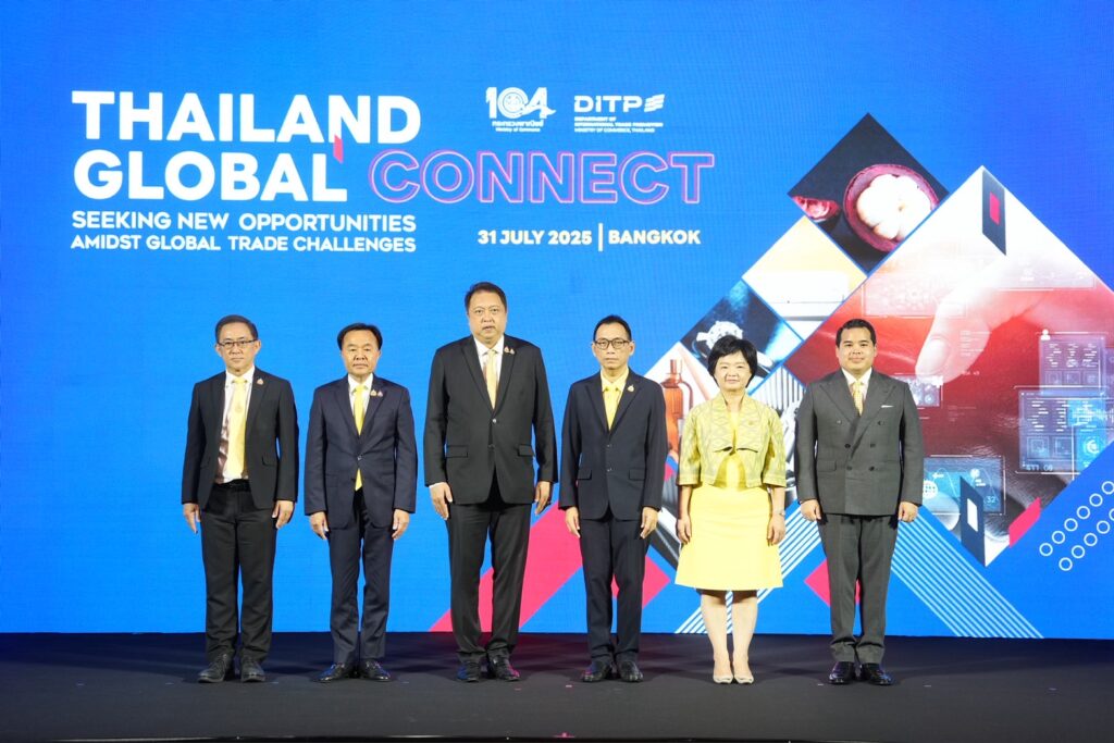 วันที่ 31 กรกฎาคม 2568 ที่โรงแรมเซ็นทารา แกรนด์ แอท เซ็นทรัลพลาซา ลาดพร้าว กรุงเทพฯ นายสุชาติ ชมกลิ่น รัฐมนตรีช่วยว่าการกระทรวงพาณิชย์ เป็นประธานเปิดงาน “จับคู่ธุรกิจเชื่อมไทยสู่โลก รับมือความท้าทายการค้าโลก” (Thailand – Global Connect: Seeking New Opportunities amidst Global Trade Challenges) โดยมีจ่าเอก ยศสิงห์ เหลี่ยมเลิศ ผู้ช่วยเลขานุการรัฐมนตรีว่าการกระทรวงพาณิชย์ นายพีรวัส สมวงศ์ ที่ปรึกษารัฐมนตรีช่วยว่าการกระทรวงพาณิชย์ นายเอกฉัตร ศีตวรรัตน์ รองปลัดกระทรวงพาณิชย์ นางสาวสุนันทา กังวาลกุลกิจ อธิบดีกรมส่งเสริมการค้าระหว่างประเทศ (DITP) และคณะผู้บริหารกระทรวงพาณิชย์ และภาคเอกชนเข้าร่วมคับคั่ง