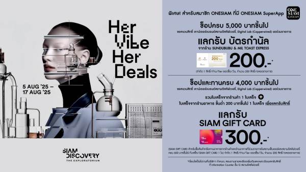 ไม่เพียงเท่านี้ รับโปรโมชั่นพิเศษ HER VIBE HER DEALS ช็อปในสไตล์ที่เป็นคุณ พร้อมรับดีลสุดพิเศษที่สยามดิสคัฟเวอรี่ เอาใจสายช็อปและสายกิน! สำหรับสมาชิก ONESIAM ที่มี ONESIAM SuperApp ช็อปครบ 5,000 บาทขึ้นไป รับบัตรกำนัลจาก SUNDUBUBU & MIL TOAST EXPRESS มูลค่า 200 บาท และเมื่อช็อปและทานอาหารครบ 4,000 บาทขึ้นไป รับ SIAM GIFT CARD มูลค่า 300 บาท ระหว่างวันนี้ ถึง 17 สิงหาคม 2568