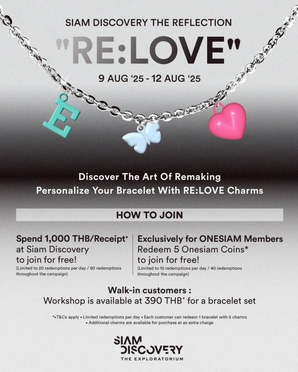 ร่วมกิจกรรมง่าย ๆ เพียงซื้อสินค้าภายในสยามดิสคัฟเวอรี่ ตั้งแต่ 1,000.- ขึ้นไป/ใบเสร็จ หรือสำหรับสมาชิก ONESIAM Member แลก 5 ONESIAM COINS ส่วนลูกค้า Walk-in สามารถเข้าร่วม Workshop ในราคา 390 บาท ต่อ 1 ชุด และพิเศษเฉพาะลูกค้า ONESIAM Member ในราคาพิเศษเพียง 320 บาทเท่านั้น ในวันที่ 9-12 สิงหาคม 2568 ณ Creative Space ชั้น 3