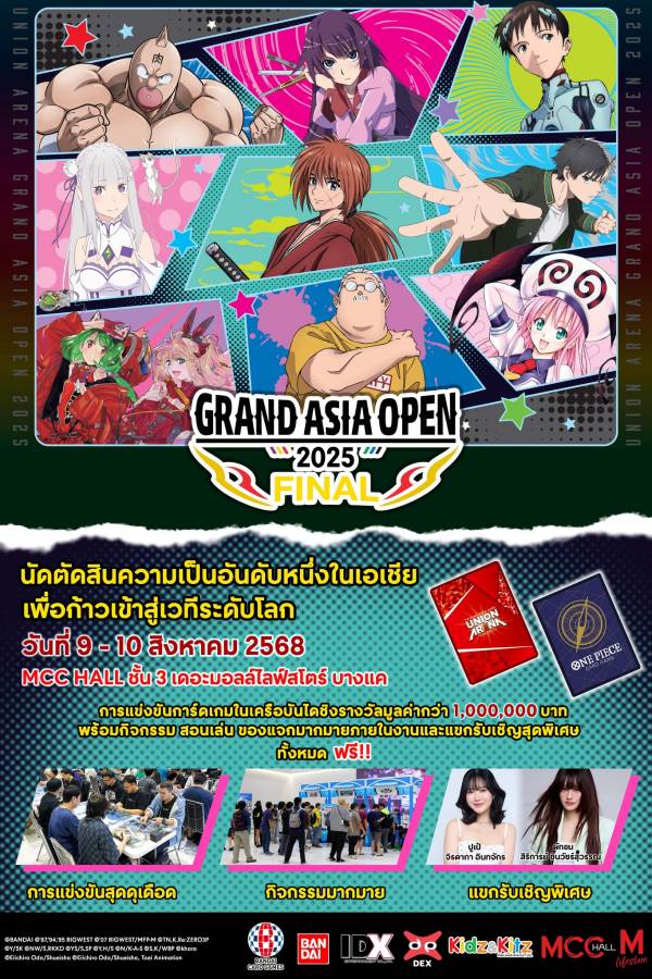 โดยงาน “GRAND ASIA OPEN 2025 Final” เป็นอีเวนต์การแข่งขันการ์ดเกมระดับเอเชียที่สำคัญ 2 รายการ คือ ONE PIECE CARD GAME และ Union Arena ซึ่งเริ่มดำเนินการแข่งขันรอบคัดเลือกในแต่ละภูมิภาคมาตั้งแต่เดือนพฤษภาคม 2568 ที่ผ่านมา เพื่อเฟ้นหาตัวแทนระดับเอเชียสู่การแข่งขันรอบสุดท้ายในประเทศญี่ปุ่น ซึ่งงานในครั้งนี้ จะถูกจัดขึ้นต่อเนื่อง 2 วัน ระหว่างวันที่ 9-10 สิงหาคม 2568 โดยการแข่งขันวันแรก จะเป็นรอบ Last Chance ของผู้เล่นแต่ละรายการ เพื่อเปิดโอกาสให้ผู้เล่นจากทุกภูมิภาคที่เคยตกรอบหรือพลาดโอกาสเข้าร่วม ได้มาร่วมแข่งขันกันอีกครั้ง ซึ่งผู้เล่นที่ได้อันดับสูงสุด 2 คน จะได้เข้าร่วมแข่งขันรอบต่อไปในงานวันที่ 2 ร่วมกับผู้เล่นที่ได้รับคัดเลือกจากแต่ละภูมิภาคมาก่อนหน้านี้ รวม 16 คน