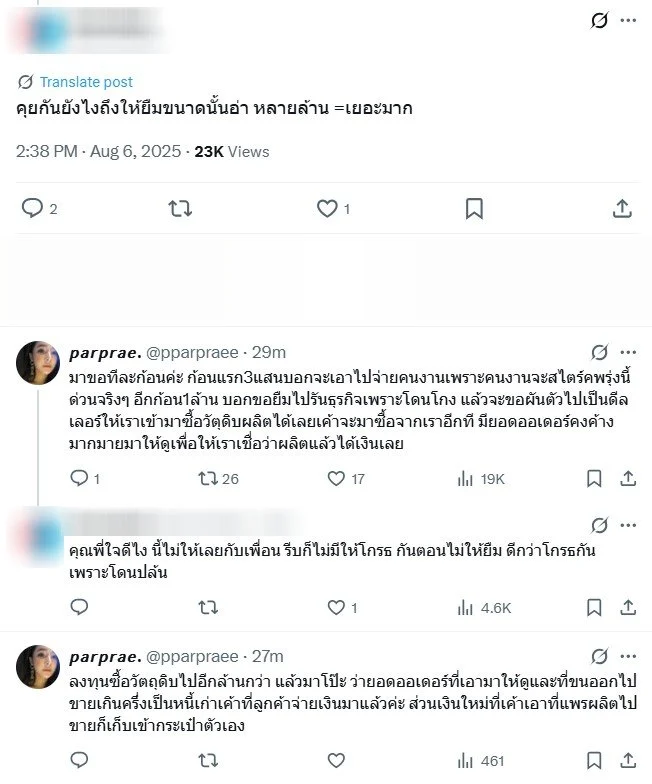 - ก้อนต่อมาอีก 1 ล้านบาท บอกว่าจะนำไปรันธุรกิจเพราะถูกโกง พร้อมเสนอว่า หากผ้าแพรลงทุนจะให้เป็นดีลเลอร์วัตถุดิบผลิตสินค้า โดยมีออร์เดอร์ลวงมาแสดงเพื่อสร้างความน่าเชื่อถือ