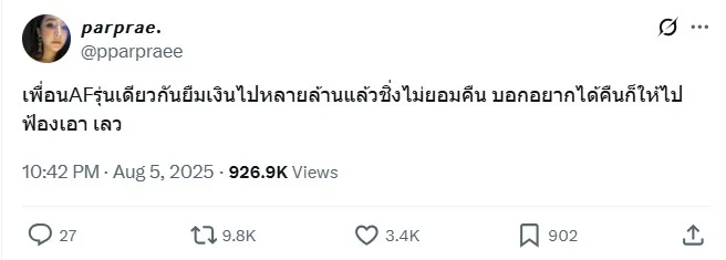 ทำเอาโซเชียลลุกเป็นไฟ เมื่ออดีตนักร้องสาวจากเวที Academy Fantasia ซีซั่น 7 อย่าง ผ้าแพร AF7 ได้ออกมาโพสต์ข้อความสุดเดือด ผ่าน X : 𝘱𝘢𝘳𝘱𝘳𝘢𝘦. พร้อมกับแฉพฤติกรรมของเพื่อนร่วมรุ่นใน AF ที่ยืมเงินเไปหลายล้านบาท และไม่ได้คืน