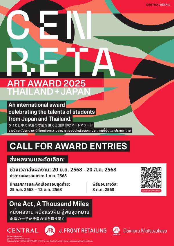 ห้างเซ็นทรัล ในเครือเซ็นทรัล รีเทล เดสติเนชันที่สร้างแรงบันดาลใจในทุกช่วงเวลาของชีวิตของคนทุกไลฟ์สไตล์และทุกเจเนอเรชัน จับมือ J. Front Retailing ผู้นำธุรกิจรีเทลขนาดใหญ่ของญี่ปุ่น เดินหน้าสนับสนุนศิลปินรุ่นใหม่ให้ได้รับโอกาสและการพัฒนาศักยภาพอย่างต่อเนื่อง จัดประกวดผลงานศิลปะนานาชาติ “CENRETA ART AWARD 2025” ภายใต้สโลแกน “หนึ่งผลงาน หนึ่งแรงฝัน สู่พันจุดหมาย (One Act, A Thousand Miles)” เปิดพื้นที่ให้ศิลปินรุ่นใหม่ที่เป็นนักเรียน นักศึกษาในระดับโรงเรียนอาชีวะ มหาวิทยาลัย และระดับบัณฑิตศึกษา ที่อาศัยอยู่ในประเทศไทยหรือประเทศญี่ปุ่น ร่วมส่งผลงานศิลปะเข้าร่วมประกวดในหัวข้อ “EXCHANGE” ที่มุ่งเน้นให้ผลงานสื่อถึงความสัมพันธ์ของตัวเอง คนรอบข้าง หรือสิ่งของต่าง ๆ ท่ามกลางโลกในยุคดิจิทัลที่ศิลปะได้เชื่อมต่อสิ่งเหล่านี้เข้าหากัน โดยมีเนื้อหาหลักที่สำคัญ ได้แก่ การแลกเปลี่ยน, การเปลี่ยนแปลง, การสะท้อน, การเจรจาข้ามวัฒนธรรม, มุมมองใหม่, การใคร่ครวญ, การค้นพบ, การมีปฏิสัมพันธ์, การข้ามพรมแดน สู่การค้นพบศักยภาพที่ไร้ขีดจำกัดของตนเองผ่านผลงานอันสร้างสรรค์ ชิงเงินรางวัล พร้อมโอกาส จัดแสดงผลงานในงานศิลปะระดับนานาชาติ! ที่ห้างเซ็นทรัลชิดลม อาร์ตคอมมูนิตี้สุดชิคใจกลางกรุงเทพมหานคร