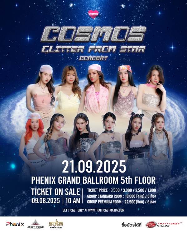 หลังจากสร้างปรากฏการณ์แฟนด้อมถล่มโลกโซเชียลมาแล้วหลายครั้ง ในที่สุด COSMOS เกิร์ลกรุปที่กำลังมาแรงที่สุดของยุคนี้ กับ 11 เมมเบอร์สาว ”อันดา-ลูกแก้ว-นุ่น-แพรวา-ปิ่น-ซีนโฮ-อะตอม-เดวี่-เจนนี่-ส้ม-แพม“ เตรียมจัดคอนเสิร์ตใหญ่เต็มรูปแบบครั้งแรกในชื่อ “COSMOS GLITTER FROM STAR CONCERT” ที่จะพาแฟน ๆ ทุกคนทะยานสู่จักรวาลแห่งความฝัน สัมผัสพลังแห่งสเตจที่ทั้งสว่างไสวและอบอุ่นในเวลาเดียวกัน