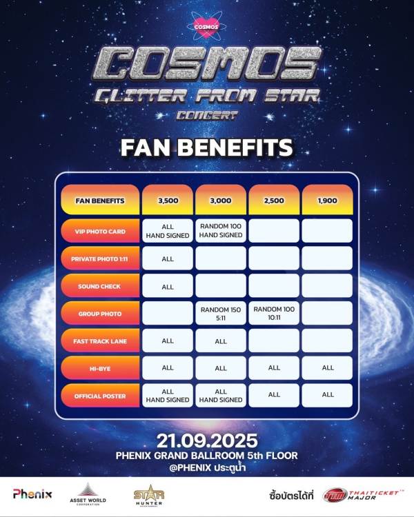 ด้วยการออกแบบโชว์ที่จัดเต็มทั้งแสง สี เสียง และการแสดงบนเวทีสุดเซอร์ไพรส์จากเมมเบอร์ COSMOS ทั้งหมด งานนี้ไม่ใช่แค่คอนเสิร์ต แต่เป็นประสบการณ์ที่แฟนตัวจริงพลาดไม่ได้เด็ดขาด!!