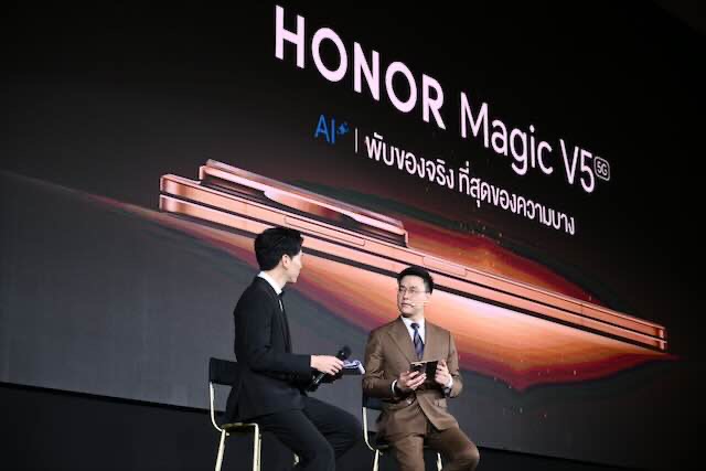ด้าน นายพลภัทร์ สายบัวทอง ประธานเจ้าหน้าที่ฝ่ายปฏิบัติการ บริษัท ออเนอร์ ประเทศไทย กล่าว เสริมว่า “วันนี้ผมภูมิใจที่จะประกาศว่า เราทำสำเร็จแล้วกับการเปิดตัว HONOR Magic V5 อุปกรณ์ที่ไม่ใช่เพียงสมาร์ตโฟนจอพับ แต่คือนิยามใหม่ของอุตสาหกรรมด้วยการเป็นสมาร์ตโฟนจอพับที่ทั้งบางและเบาที่สุด ซึ่งเกิดจากการผสานเทคโนโลยีหลัก 3 ประการเข้าด้วยกันอย่างลงตัว ได้แก่ เทคโนโลยีแบตเตอรี่ขั้นสูง ที่พัฒนาสถาปัตยกรรมใหม่ให้เล็กลงแต่ยังคงทรงพลังการผลิตที่ขับเคลื่อนด้วย AI ช่วยเพิ่มความแม่นยำตั้งแต่การเลือกวัสดุจนถึงการประกอบและควบคุมคุณภาพ ทำให้แข็งแกร่งและเชื่อถือได้ วัสดุใหม่เพื่ออนาคต ที่ทั้งแข็งแรง ทนทานต่อการพับ และมีน้ำหนักเบา ทำให้พกพาสะดวกยิ่งกว่าเดิม”
