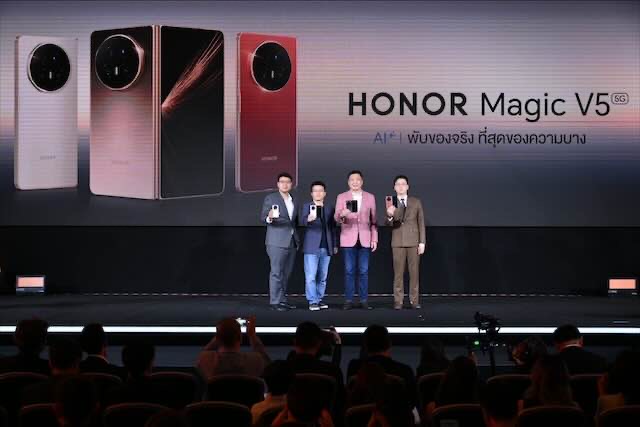 19 สิงหาคม 2568, กรุงเทพฯ – ออเนอร์ (HONOR) ผู้ให้บริการอุปกรณ์อัจฉริยะชั้นนำระดับโลก เดินหน้ารุกตลาดสมาร์ตโฟนจอพับในประเทศไทยเต็มกำลัง เจาะกลุ่มผู้บริโภคไฮเอนด์ที่มองหานวัตกรรมเหนือระดับ เปิดตัว HONOR Magic V5 สมาร์ตโฟนจอพับแฟลกชิปรุ่นใหม่ ภายใต้สโลแกน “พับของจริง ที่สุดของความบาง – Slimmest with No Compromise” ชูจุดเด่นดีไซน์หรูหราล้ำสมัย บางที่สุดในโลกเพียง 8.8มิลลิเมตร เมื่อพับหน้าจอ พร้อมทนทานไม่แพ้ใครงด้วยมาตรฐานกันน้ำและฝุ่น IP58 และ IP59 ที่รองรับการใช้งานได้ทุกสถานการณ์ เสริมพลังด้วยแบตเตอรี่ HONOR Silicon-Carbon รุ่นใหม่ บางเพียง 2.59 มิลลิเมตร แต่ให้ความจุสูงถึง 5,820mAh ผสาน Advance AI ทรงพลัง และฟังก์ชันการทำงานอัจฉริยะครบ เพื่อมอบประสบการณ์การใช้งานยุคใหม่อย่างไร้ขีดจำกัด HONOR Magic V5 วางจำหน่ายอย่างเป็นทางการในประเทศไทยในวันที่ 30 สิงหาคม 2568 เป็นต้นไป ในราคา 57,990 บาท พร้อมข้อเสนอสุดพิเศษมากมาย โดยเปิดให้ Pre-order ระหว่างวันที่ 20 – 29 สิงหาคม 2568 รับสิทธิ์ส่วนลดเพิ่มทันที 7,000 บาท เมื่อใช้สิทธิ์เก่าแลกใหม่ (เฉพาะร้านค้าตัวแทนจำหน่ายที่ร่วมรายการ) มั่นใจยิ่งขึ้นด้วยบริการหลังการขายเหนือระดับ ทั้งประกันเสียไม่ซ่อม เปลี่ยนเครื่องใหม่ทันทีภายใน 90 วัน, ขยายประกันตัวเครื่องจาก 1 ปี เป็น 2 ปีเต็ม, ประกันหน้าจอแตก 180 วัน พิเศษสุด! เมื่อซื้อ HONOR Magic V5 ที่ HONOR Experience Store รับฟรีทันที HONOR Choice Foldable Bluetooth Keyboard มูลค่า 2,499 บาท