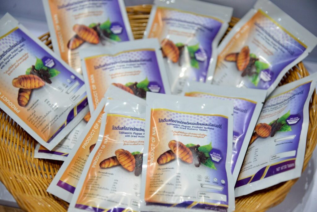 ผลิตภัณฑ์โปรตีนจากดักแด้ไหมผสมมัลเบอร์รี่อัดเม็ดเป็นการพัฒนาต่อยอดจากโปรตีนผง โดยนำไปผสมกับลูกหม่อนหรือมัลเบอร์รี่เพื่อเพิ่มรสชาติ