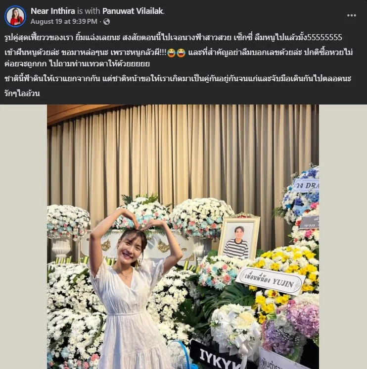 หลังจากนั้น สาวเนียร์ ก็โพสต์ภาพคู่กับแฟนหนุ่มในงานศพ พร้อมแคปชั่นที่เต็มไปด้วยความรู้สึกเศร้าไว้ว่า “รูปคู่สุดเฟี้ยววของเรา ยิ้มแฉ่งเลยนะ สงสัยตอนนี้ไปเจอนางฟ้าสาวสวย เซ็กซี่ ลืมหนูไปแล้วมั้ง55555555”