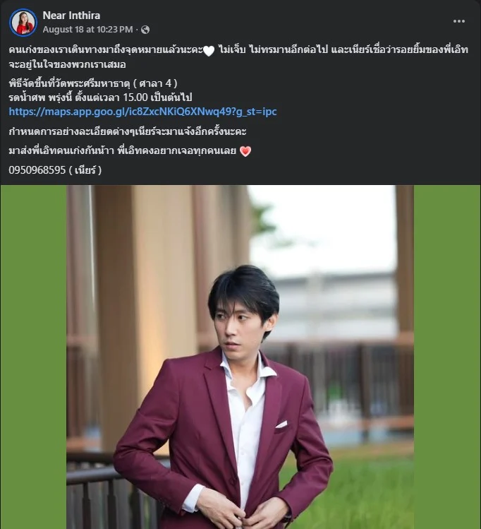 โดยระบุว่า คนเก่งของเราเดินทางมาถึงจุดหมายแล้วนะคะ ไม่เจ็บ ไม่ทรมานอีกต่อไป” พร้อมระบุว่ารอยยิ้มของแฟนหนุ่มจะอยู่ในใจของทุกคนเสมอ โดยได้แจ้งกำหนดการพิธีรดน้ำศพที่วัดพระศรีมหาธาตุ ศาลา 4 รวมถึงขอให้เพื่อน ๆ ในวงดนตรีของแฟนหนุ่มนำเครื่องดนตรีมาร่วมเล่นในงานด้วย เพราะเชื่อว่า “คุณชายเขาชอบฟังเพลง”