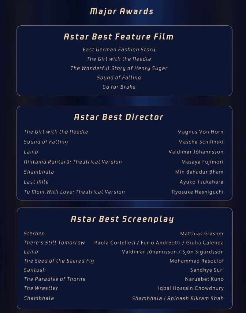 งานมอบรางวัล Astar Award 2025 จะจัดขึ้นที่ กรุงเทพมหานคร ประเทศไทย ในวันที่ 27 สิงหาคม 2025 โดยมีศิลปิน นักวิชาการ ผู้เชี่ยวชาญด้านเทคโนโลยี และคนรุ่นใหม่จากทั่วโลกเข้าร่วม เพื่อร่วมเป็นประจักษ์พยานอีกก้าวสำคัญของอุตสาหกรรมภาพยนตร์นานาชาติ
