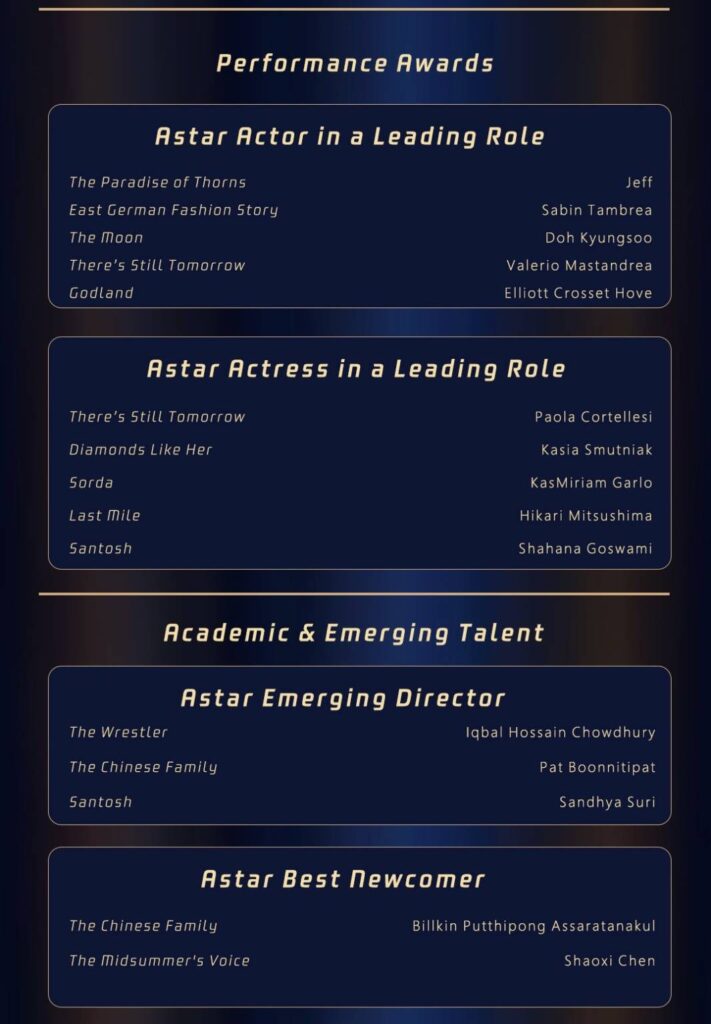 สถาบันนานาชาติวิทยาศาสตร์และศิลปะภาพยนตร์ (International Institute of Film Science and Arts – IIFSA) ประกาศรายชื่อผู้เข้าชิงรางวัล “Astar Award” ประจำปี 2025 อย่างเป็นทางการ โดยมีวัตถุประสงค์เพื่อส่งเสริมการบูรณาการศิลปะภาพยนตร์และเทคโนโลยีระดับโลก พร้อมยกย่องผู้สร้างสรรค์ผลงานที่โดดเด่นในด้านภาพยนตร์ นวัตกรรม งานวิจัย การศึกษา และการแลกเปลี่ยนวัฒนธรรม