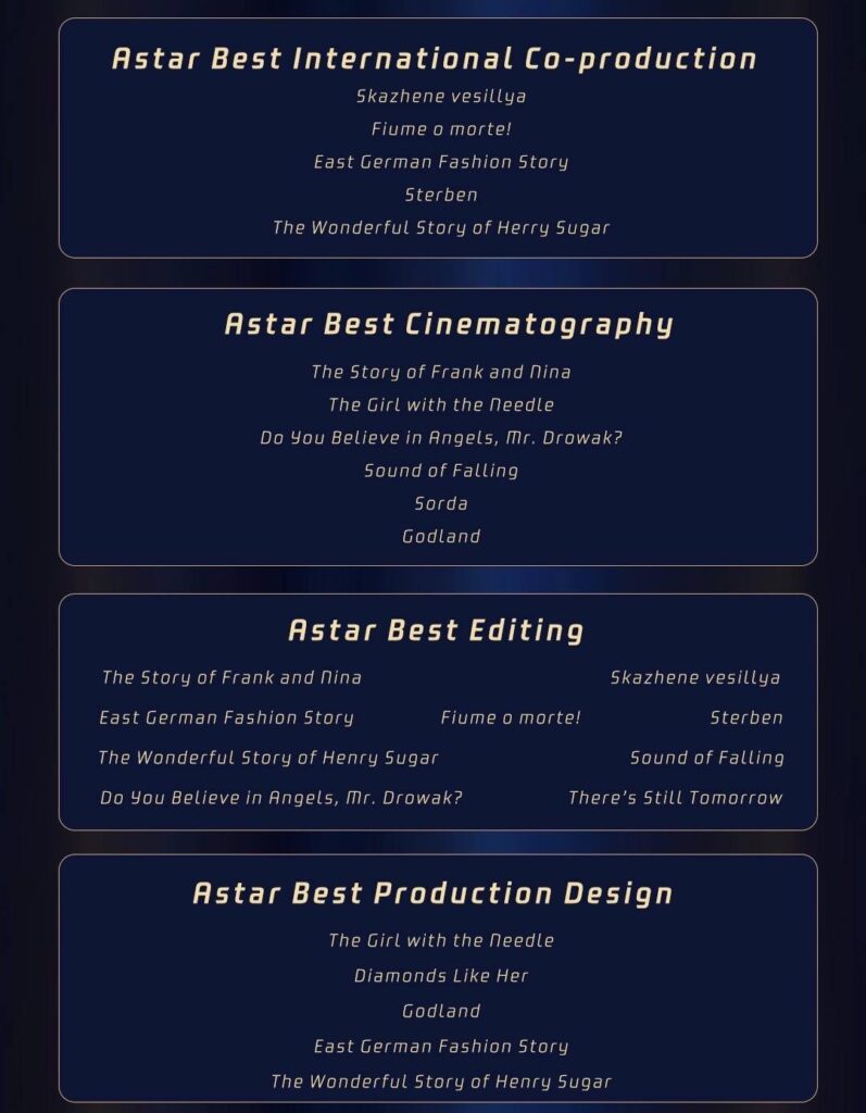 ทั้งนี้ รายชื่อผู้เข้าชิงปีนี้ครอบคลุมกว่า 20 สาขารางวัล จากกว่า 30 ประเทศและภูมิภาคทั่วโลก สะท้อนถึงความหลากหลายของวงการภาพยนตร์สากล ทั้งในด้านความคิดสร้างสรรค์ทางศิลปะ การผสมผสานเทคโนโลยี และการเล่าเรื่องที่เน้นมิติความเป็นมนุษย์