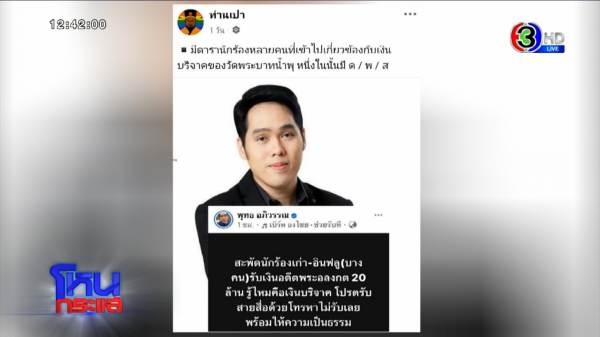 พ.ต.ท.สิริพงษ์ : พูดไม่ออก ผมว่าน่าจะสะท้อนความรู้สึกพุทธศาสนิกชนที่กำลังดูรายการ ว่าความรู้สึกเขารู้สึกยังไง เวลาเขาบริจาคเงินแล้วตัวผู้นำองค์กร เอาเงินมาใช้ลักษณะแบบนี้ ถ้าเป็นเงินส่วนตัวโอเคไม่เป็นไรครับ แต่ถ้าตรวจสอบแล้วเป็นเงินวัด อันนี้คือความรู้สึกเศร้าใจก่อน คนบริจาค เขาบริจาคให้ท่าน ให้วัด ถ้าเป็นเงินวัด อันนี้ไม่จบ เพราะเงินวัดต้องใช้กับกิจของสงฆ์ เพื่อสาธารณประโยชน์ ท่านเจ้าอาวาสไม่มีสิทธิ์เอามาให้บุคคลยืม ยกเว้นเป็นเงินส่วนตัว แต่ต้องพิสูจน์ โอนผ่านบัญชีหนีไม่พ้นอยู่แล้ว มีสัญญาไม่มีสัญญาก็ไม่เป็นไร เดี๋ยวต้องตรวจสอบว่าคนโอนเอาเงินจากไหน เจ้าอาวาสก็ต้องยืนยันว่าเงินจากไหน ถ้าท่านบอกเป็นเงินส่วนตัว แต่ถ้าเราตรวจสอบแล้ว เงินถูกโยนออกมาจากบัญชีแล้วเข้าบัญชคนใกล้ตัวท่าน แล้วโอนไปต่อบัญชีคุณสมปอง อันนี้อาจจะเหนื่อย เพราะตรงนี้คือข้อเท็จจริง