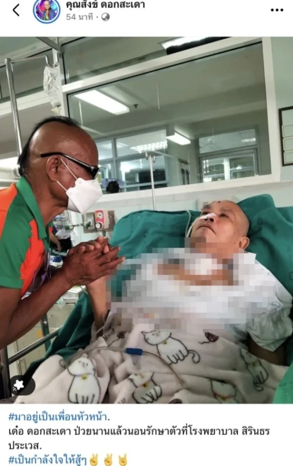 โดย สังข์ ดอกสะเดา ได้เขียนแคปชั่นว่า “มาอยู่เป็นเพื่อนหัวหน้า เด๋อ ดอกสะเดา ป่วยนานแล้ว นอนรักษาตัวที่รพ.สิรินทร ประเวศ เป็นกำลังใจให้สู้ๆ น้า”