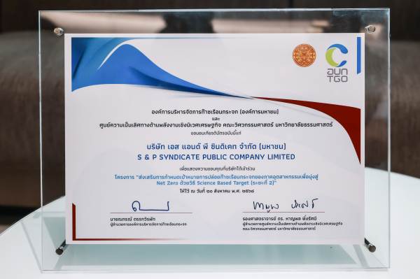 บริษัท เอส แอนด์ พี ซินดิเคท จำกัด (มหาชน) โดย คุณมณีสุดา ศิลาอ่อน ประธานเจ้าหน้าที่สำนักพัฒนาความยั่งยืนและสื่อสารองค์กร รับมอบใบประกาศเกียรติคุณแก่องค์กรนำร่องที่เข้าร่วม “โครงการส่งเสริมการกำหนดเป้าหมายการปล่อยก๊าซเรือนกระจกของภาคอุตสาหกรรม เพื่อมุ่งสู่ Net Zero ด้วยวิธี Science Based Target (ระยะที่ 2)” จัดโดย องค์การบริหารจัดการก๊าซเรือนกระจก (องค์กรมหาชน) ร่วมกับศูนย์ความเป็นเลิศทางด้านพลังงานเชิงนิเวศเศรษฐกิจ (ECEE) ภาควิชาวิศวกรรมเคมี คณะวิศวกรรมศาสตร์ มหาวิทยาลัยธรรมศาสตร์ โดย S&P เป็น 1 ใน 22 องค์กรนำร่องที่มีส่วนร่วมในการกำหนดเป้าหมาย และแผนการดำเนินงานลดก๊าซเรือนกระจก นำไปสู่การบรรลุเป้าหมายการปล่อยก๊าซเรือนกระจกสุทธิเป็นศูนย์ (Net Zero) โดยมีคุณณัฐริกา วายุภาพ นิติพน รองผู้อำนวยการองค์การบริหารจัดการก๊าซเรือนกระจก เป็นประธานในพิธี ณ โรงแรมพูลแมน คิง เพาเวอร์ กรุงเทพ (รางน้ำ) เมื่อเร็วนี้