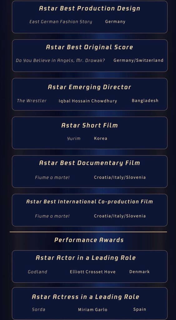 เมื่อไม่นานนี้ พิธีมอบรางวัล Astar Award ครั้งแรกได้จัดขึ้นอย่างยิ่งใหญ่ที่ The Peninsula Lawn ในกรุงเทพฯ พิธีการในครั้งนี้มีธีมหลักว่า “ความหลากหลายที่หลอมรวม สืบสานวัฒนธรรม และนวัตกรรมเพื่ออนาคต” โดยได้กำหนดรางวัลออกเป็น 5 หมวดหลัก ได้แก่ หมวดการแสดง หมวดวัฒนธรรม หมวดวิชาการ หมวดความหลากหลายและอนาคต และหมวดเกียรติยศพิเศษ รวมทั้งหมด 29 รางวัล ในงานพิธีมีผู้มีความรู้ความสามารถมาร่วมงานมากมาย ภาพยนตร์ยอดเยี่ยม บุคคลในวงการภาพยนตร์ และผู้เชี่ยวชาญทางวิชาการจำนวนมากได้รับรางวัลจากการแสดงความสามารถอันยอดเยี่ยมและผลงานทางวิชาการ ซึ่งเป็นการเติมพลังใหม่ให้แก่แวดวงภาพยนตร์และการวิจัยวิชาการด้านภาพยนตร์