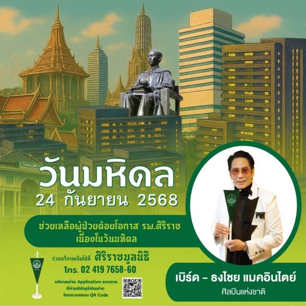 เบิร์ด-ธงไชย พร้อมด้วย ครูสลา-คุณวุฒิ ยกทัพศิลปิน ไผ่-พงศธร, ต่าย-อรทัย, หญิงลี ศรีจุมพล, ตูน-อาทิวราห์, แบงค์-ปรีติ, และ โจอี้-ภูวศิษฐ์ ศิลปินสังกัด จีเอ็มเอ็ม มิวสิคร่วมเชิญชวนประชาชนเป็นผู้ให้ เนื่องในวันมหิดล ประจำปี 2568 โดยการบริจาคเพื่อสมทบทุนช่วยเหลือผู้ป่วยด้อยโอกาส โรงพยาบาลศิริราช รวมทั้งเพื่อจัดซื้ออุปกรณ์ทางการแพทย์ และพัฒนาศูนย์ความเป็นเลิศทางการแพทย์ศิริราช