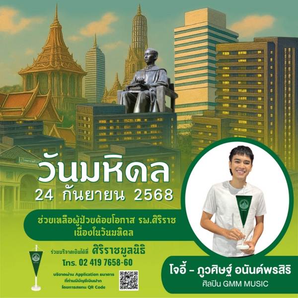 โดยในปีนี้ แป้งร่ำ-ศิวนารี ศิลปินสังกัด จีเอ็มเอ็ม มิวสิคพร้อมด้วย แอลม่อน-ภูมิวรรณ และ โปรเกรส-ภาสวิชญ์ นักแสดงสังกัด จีเอ็มเอ็มทีวี ได้เข้าร่วมงานแถลงข่าว “ศิริราชรวมใจศิลปินช่วยเหลือผู้ป่วย เนื่องในวันมหิดล 2568” จัดโดย คณะแพทยศาสตร์ศิริราชพยาบาล มหาวิทยาลัยมหิดล พร้อมออกรับบริจาคร่วมกับนักศึกษาแพทย์วิทยาเขตบางกอกน้อย และมอบธงที่ระลึกให้แก่ผู้มีจิตศรัทธา ซึ่งบรรยากาศเต็มไปด้วยรอยยิ้มและความอบอุ่น ท่ามกลางความคึกคักของเหล่าแฟนคลับและประชาชนที่ให้ความสนใจเข้าร่วมบริจาคกันอย่างเนืองแน่น
