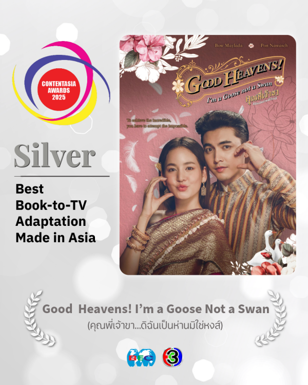 ต่อด้วยรางวัล Silver – Best Book-to-TV Adaptation Made in Asia จากละคร คุณพี่เจ้าขา…ดิฉันเป็นห่านมิใช่หงส์ (Good Heavens! I’m a Goose Not a Swan) ที่แค่ชื่อเรื่องก็สะดุดตาแล้ว เนื้อหายังปังจนเข้าตากรรมการแบบไม่ต้องสงสัย ไม่หมดแค่นั้น! ช่อง 3 ยังคว้า Bronze มาอีก 2 สาขา ได้แก่