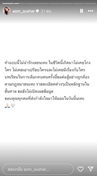 “ทำแบบนี้ไม่น่ารักเลยนะคะ ในชีวิตนี้เกิดมาไม่เคยโกงใคร ไม่เคยเอาเปรียบใคร และไม่เคยมีเรื่องกับใคร บทเรียนในการเลือกคบคนครั้งนี้ ขอต่อสู้อย่างถูกต้องตามกฎหมายนะคะ รายละเอียดต่าง ๆ เป็นหลักฐานในชั้นศาล ขอยังไม่เปิดเผยข้อมูล ขอบคุณทุกคนที่ส่งกำลังใจมาให้ออมในวันนี้นะคะ”