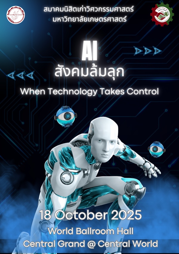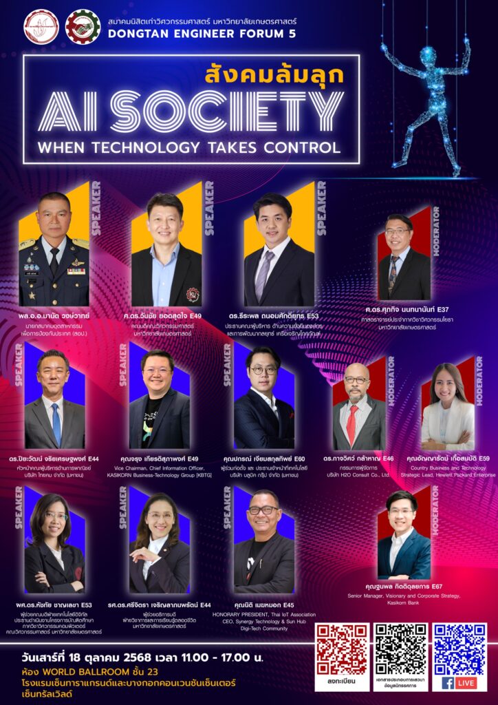 สมาคมนิสิตเก่าวิศวกรรมศาสตร์มหาวิทยาลัยเกษตรศาสตร์Dongtan Engineer Forum ครั้งที่ 5 “AI . SOCIETY สังคมล้มลุก” วันที่ 18 ตุลาคม 2568 เวลา 11.00 น. – 17.00 น.ห้อง WORLD BALLROOM ชั้น 23 โรงแรมเซ็นทาราแกรนด์และบางกอกคอนเวนชั่นเซ็นเตอร์ เซ็นทรัลเวิลด์