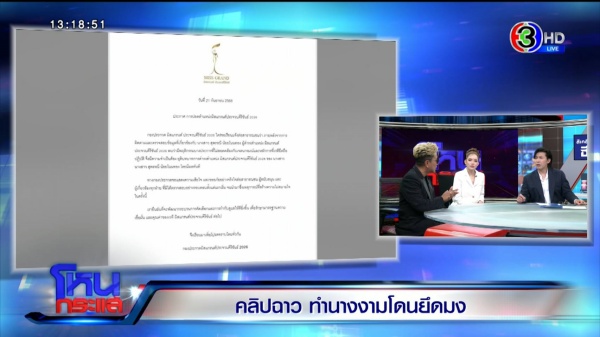 รายการ โหนกระแส วันที่ 23 ก.ย.ดำเนินรายการโดย “หนุ่ม กรรชัย กำเนิดพลอย” ผลิตในนามบริษัท ดีคืนดีวัน จำกัด ออกอากาศทุกวันจันทร์-ศุกร์ เวลา 12.35 น. ทางช่อง 3 กดหมาย เลข 33 สัมภาษณ์ เบบี๋ สุพรรณี , ใหม่ PD ประจวบฯ,  หนุ่ม ประเสริฐ เจิมจุติธรรม กูรูนางงาม, ทนายแก้ว ดร.มนต์ชัย จงไกรรัตนกุล