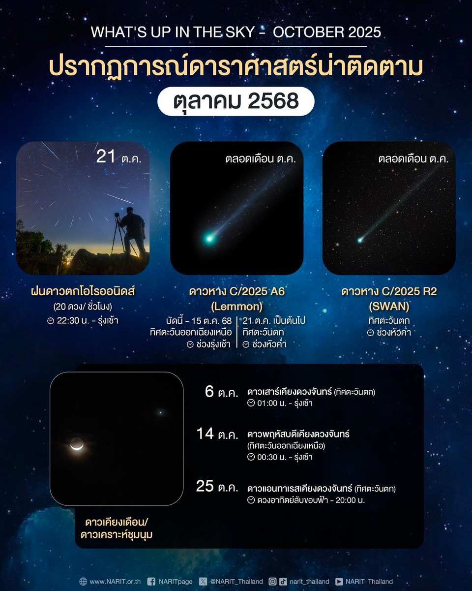 NARIT ชวนคนชอบดูดาวปักหมุด! ตลอดเดือนตุลาคม 2568 เตรียมพบ “ดาวเคียงเดือน” หลายรอบ ดาวเสาร์–พฤหัสบดี–แอนทาเรสโชว์ตัว, ฝนดาวตกโอไรออนิดส์คืน 21–22 ต.ค. ชมได้ชัดไร้แสงจันทร์รบกวน และดาวพุธปรากฏชัดสุดทางทิศตะวันตกวันที่ 30 ต.ค.