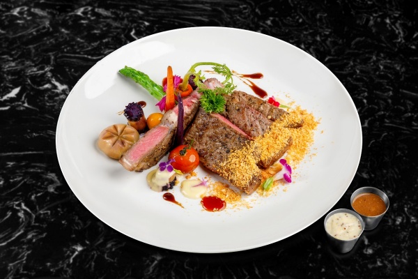 ทีโบนสเต็กซอสครีมมัสตาร์ดและซอสพริกไทย ที่สามารถเลือกระดับความสุกได้ ทานคู่กับตัวซอสของทางร้านช่วยตัดเลี่ยน และชูรสชาติเนื้อได้อย่างดีเยี่ยม