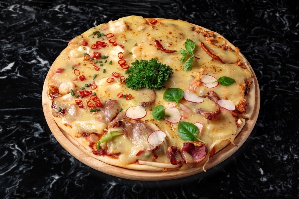 พิซซ่าเลทซ์ชิลล์ พิซซ่าแผ่นบางกรอบ โรยด้วยชีสแน่น ๆ อร่อยครบรสด้วย หน้าเป็ดกรอบ ลาบไก่ และซอสเผ็ดกุ้ง