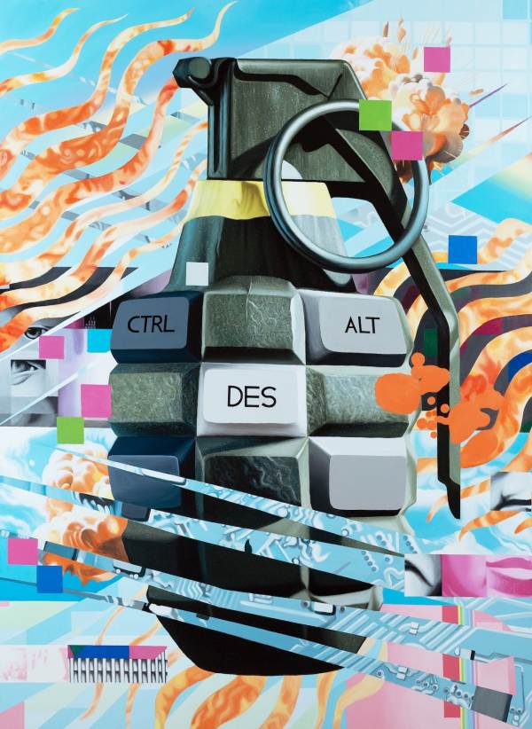 Ctrl + Alt + Destruct โดย ธัญญภัทร มานะสาระกุล ขนาด 180 x 130 ซม. เทคนิคสีน้ำมันและสีอะคริลิกบนผ้าใบ ได้รับรางวัล Most Promising Artist of the Year ปี 2568 (ประเทศไทย)
