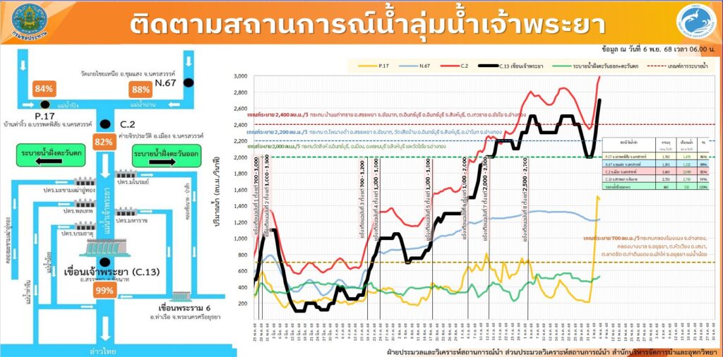 ล่าสุด วันที่ 7 พ.ย.68 กรมชลประทาน ได้คาดการณ์ว่าปริมาณน้ำที่สถานีวัดน้ำ C.2 จังหวัดนครสวรรค์ มีแนวโน้มเพิ่มขึ้นประมาณ 2,900 – 3,000 ลบ.ม./วินาที และปริมาณน้ำจากแม่น้ำสะแกกรังและลำน้ำสาขาเพิ่มขึ้นประมาณ 400 ลบ.ม./วินาที ซึ่งจะทำให้ปริมาณน้ำเหนือเขื่อนเจ้าพระยามีประมาณ 3,300 – 3,400 ลบ.ม./วินาที และรับน้ำเข้าระบบชลประทานฝั่งตะวันออกและฝั่งตะวันตกรวม 550 ลบ.ม./วินาที