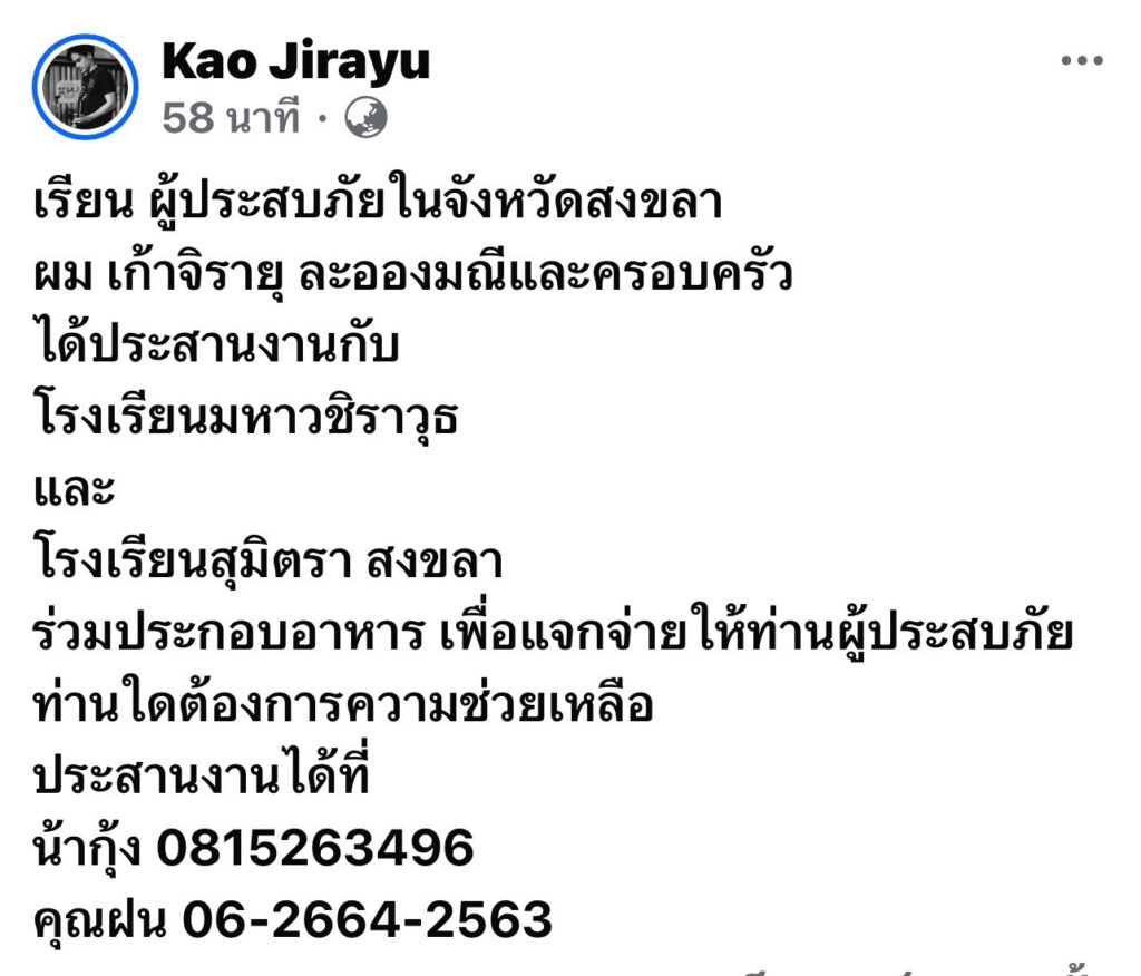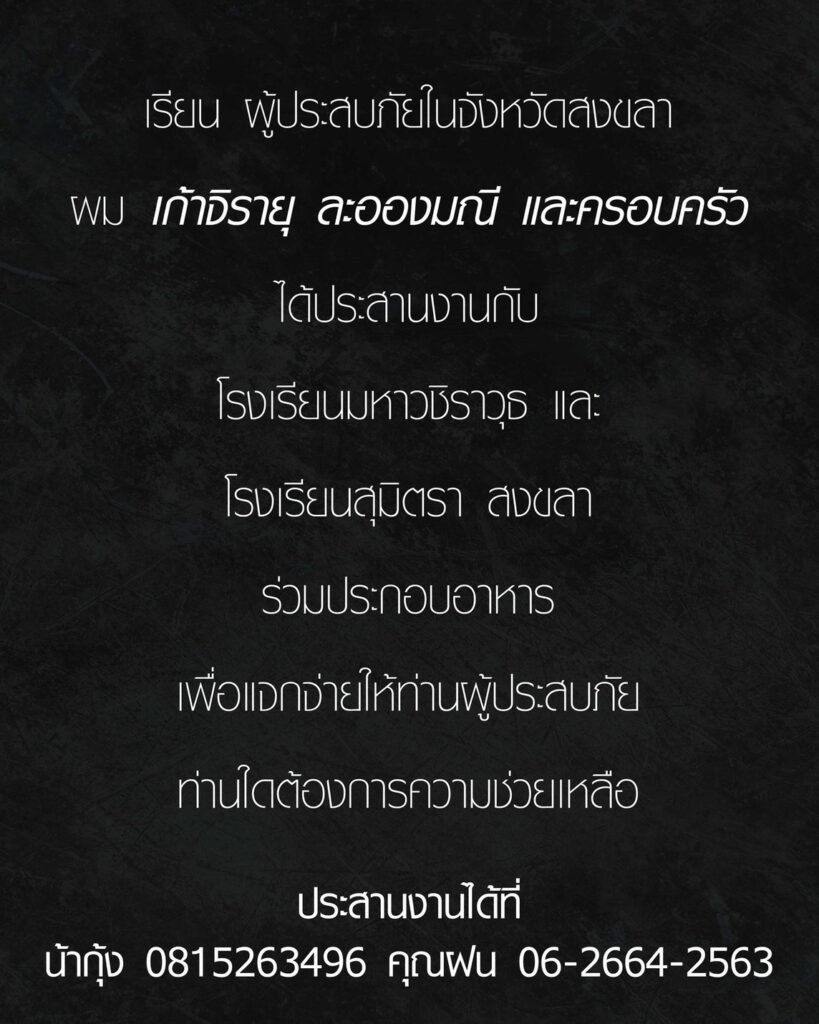 เก้า จิรายุ และครอบครัว ละอองมณี ควักเงินส่วนตัวร่วมช่วยเหลือผู้ประสบภัยน้ำท่วมจังหวัดสงขลา พร้อมประสานโรงเรียนในพื้นที่ร่วมจัดทำอาหารเพื่อบรรเทาความเดือดร้อน