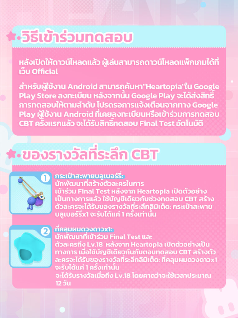 เพื่อขอบคุณทุกคนที่เข้าร่วม เกม Heartopia ได้เตรียมของขวัญสุดพิเศษมาให้นักพัฒนาที่เคย เข้าร่วมทดสอบ CBT ในครั้งแรก ใน Final Test ครั้งนี้สามารถรับรางวัลที่ระลึก: ที่คลุมผมดวงดาวและกระเป๋าสะพายบลูเบอร์รี่