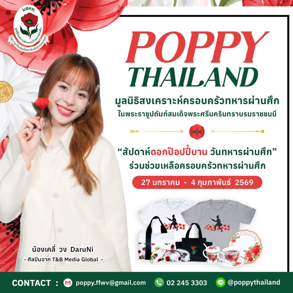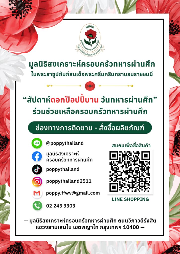 มูลนิธิฯ จึงขอเชิญชวนทุกท่านอุดหนุนดอกป๊อปปี้ที่จะได้จำหน่ายตามสถานที่ต่างๆ และผลิตภัณฑ์ อาทิ เสื้อยืด กระเป๋า แก้วน้ำ ร่ม ชุดกาแฟ ฯลฯ สามารถซื้อได้ที่ มูลนิธิสงเคราะห์ครอบครัวทหารผ่านศึก ถนนวิภาวดีรังสิต โทร 02-2453303, 092-7502642 ID Line : @poppythailand หรือเชิญอุดหนุนผลิตภัณฑ์ได้ทางลิงค์https://shop.line.me/@poppythailand หรือร่วมบริจาคได้ที่ ธนาคารกสิกรไทยสาขาสนามเป้า ชื่อบัญชีมูลนิธิสงเคราะห์ครอบทหารผ่านศึก เลขที่บัญชี 029-2-71777-6 และข้อมูลเพิ่มเติมติดตามได้ที่ Facebook : มูลนิธิสงเคราะห์ครอบครัวทหารผ่านศึก https://www.facebook.com/THAILANDPOPPY LINE : Poppy Thailand (ID: @poppythailand) Instagram : poppythailand2511 Tiktok : @poppythailand
