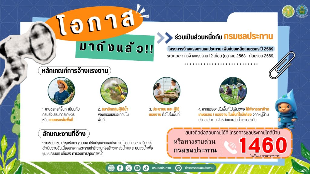 ทั้งนี้ กรมชลประทาน ยังคงเดินหน้ารับสมัครจ้างแรงงานอย่างต่อเนื่องให้ได้ตามเป้า 84,512 คน จึงขอเชิญชวนเกษตรกรหรือประชาชนที่สนใจเข้าร่วมโครงการฯ โดยสามารถติดต่อสอบถามหรือสมัครได้ที่โครงการชลประทานใกล้บ้าน หรือทางสายด่วนกรมชลประทาน 1460