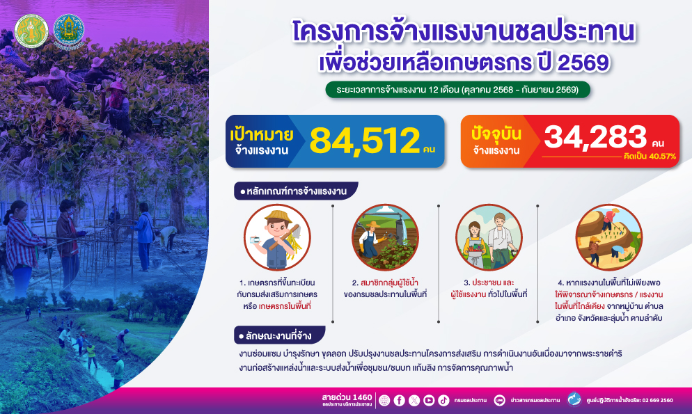 กรมชลประทาน เดินหน้าโครงการจ้างแรงงานปี 2569 เปิดโอกาสเกษตรกรและประชาชนทั่วประเทศกว่า 84,512 คน มีรายได้เสริมช่วงว่างเว้นทำเกษตร ล่าสุดจ้างแล้วกว่า 34,283 คน สมัครได้ที่โครงการชลประทานใกล้บ้าน หรือสายด่วน 1460